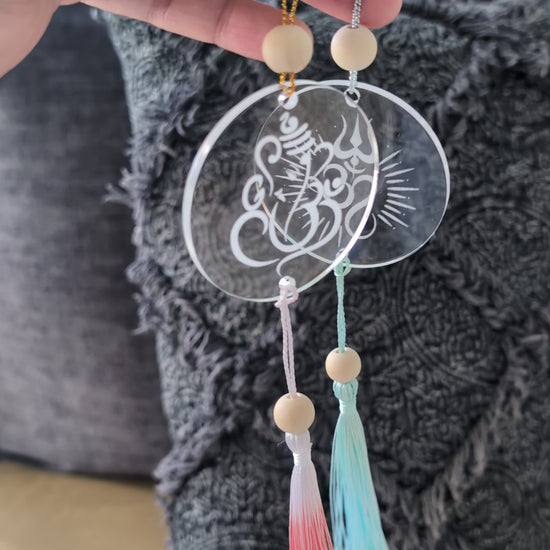 Enhance your car’s interior with our elegant Ganesh and Om designed hanging, made from clear acrylic and engraved on one side, yet beautifully visible from both sides. This spiritual charm adds a touch of serenity and style to your space. Each piece comes with a vibrant, rainbow-colored tassel, randomly selected. Perfect for yourself or as a thoughtful gift, this car hanging combines tradition with modern design for a peaceful journey every time.
