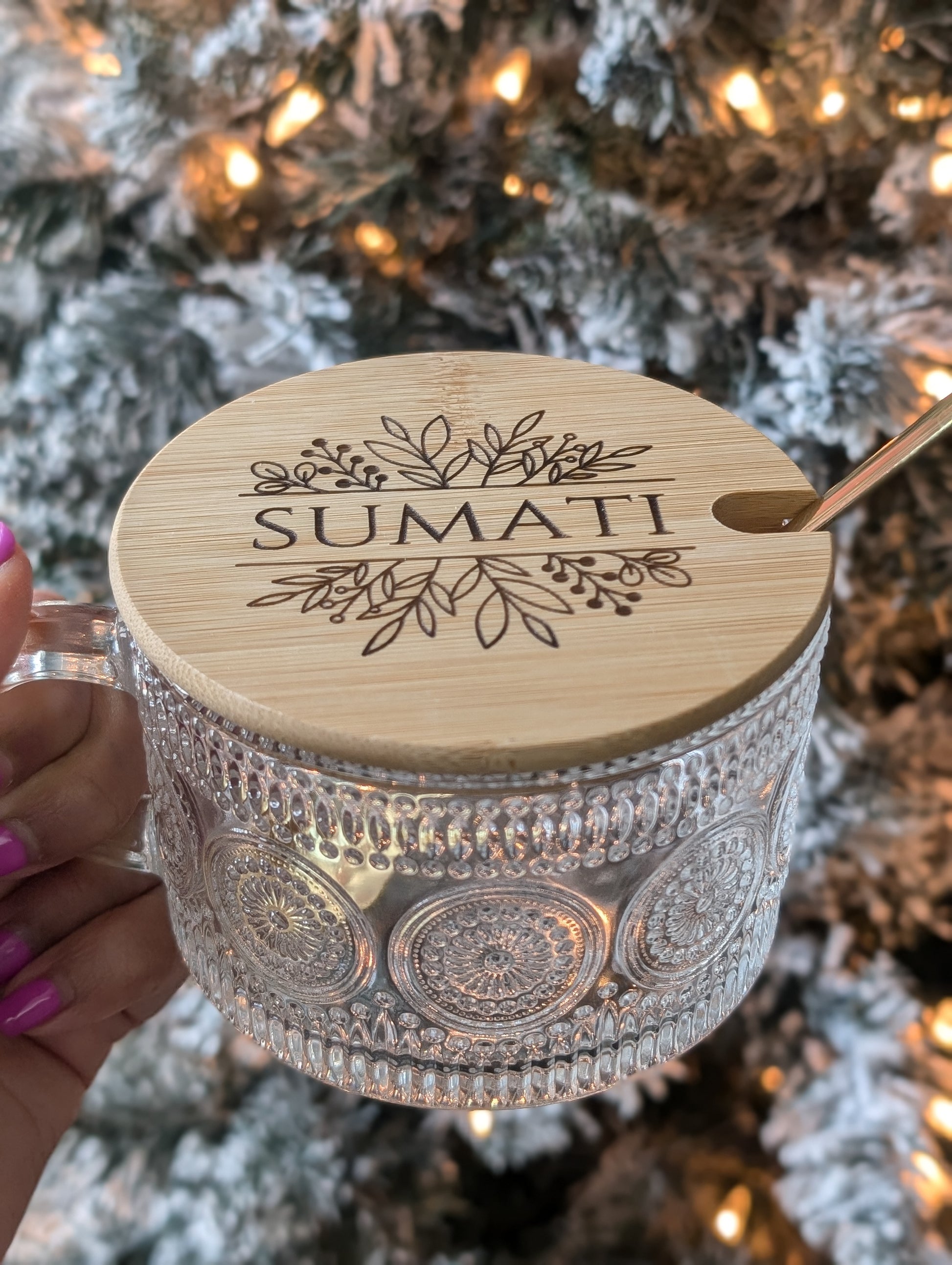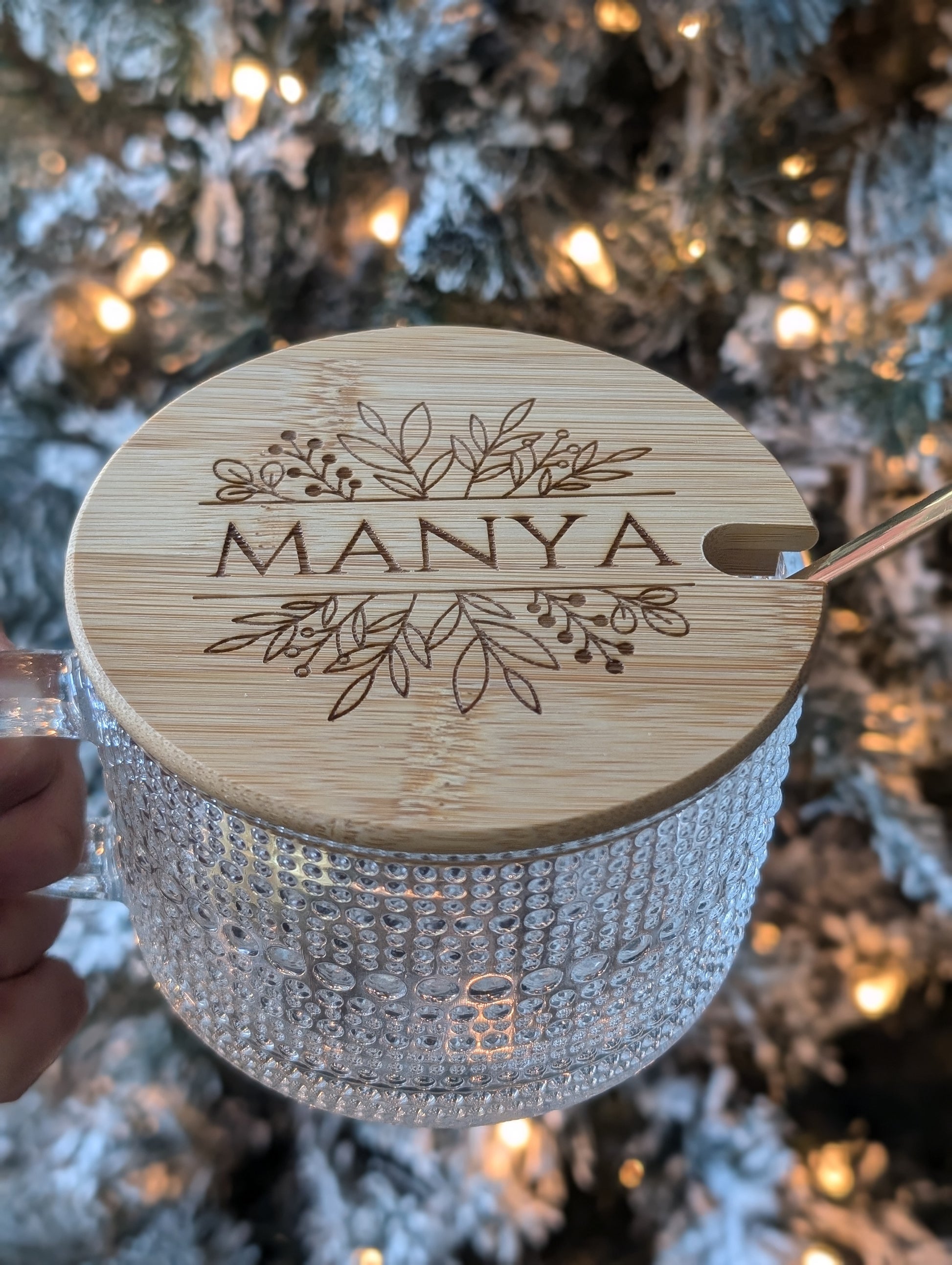 Elevate your daily routine with our Personalized Vintage Ceramic Mug, featuring a chic bamboo lid and a matching gold spoon. Perfect for drinks, overnight oats, or just to add timeless elegance with functionality to your home. Personalized with a beautiful floral design, it is a thoughtful gift for bridesmaids, parties, holidays, or other special occasions. Durable, stylish, and versatile—it's the perfect blend of practicality and charm.