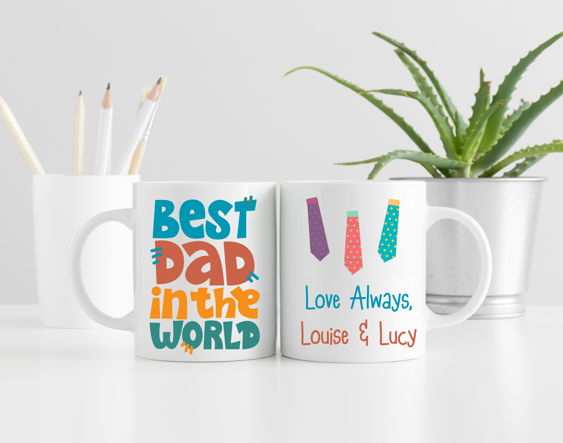 Surprise your Dad with a charming gift! This thoughtful mug features the kids' names on the bottom, adding a simple yet meaningful touch. Personalization details are displayed below.