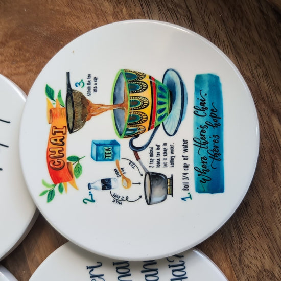 Brighten your tea time with our custom-designed chai coasters, featuring a sleek ceramic finish and four unique, fun phrases on each coaster. Perfect for chai lovers, this vibrant set adds a playful touch to your home while protecting your surfaces from heat and spills. Each coaster showcases a different phrase, bringing a smile to your face with every cup. Stylish, durable, and practical—this set is a must-have for any chai enthusiast! These come in a set of 4.