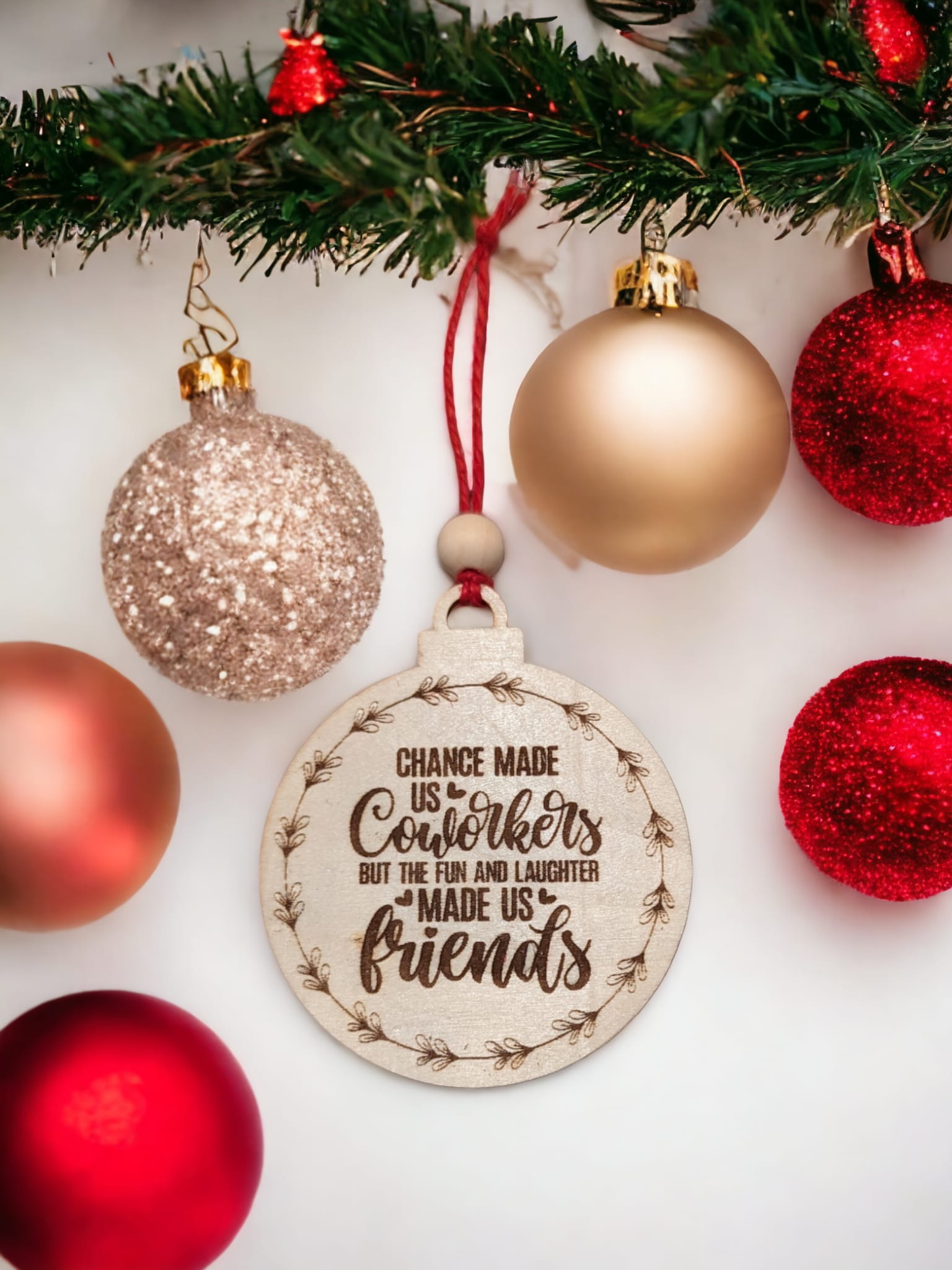 Made with care, this wooden ornament celebrates the special bond between co-workers who met by chance. It's a reminder of shared experiences and teamwork. Perfect for any workspace or holiday decoration, it honors the unique connection brought by fate.