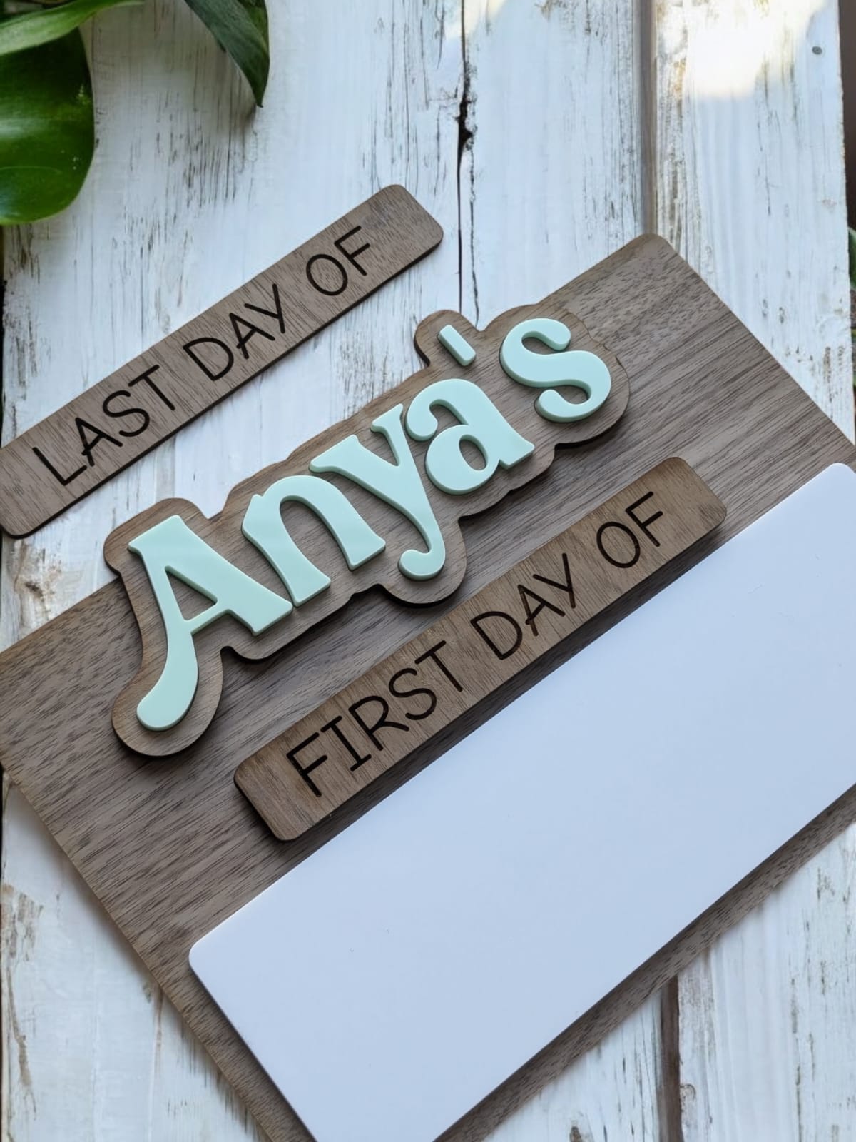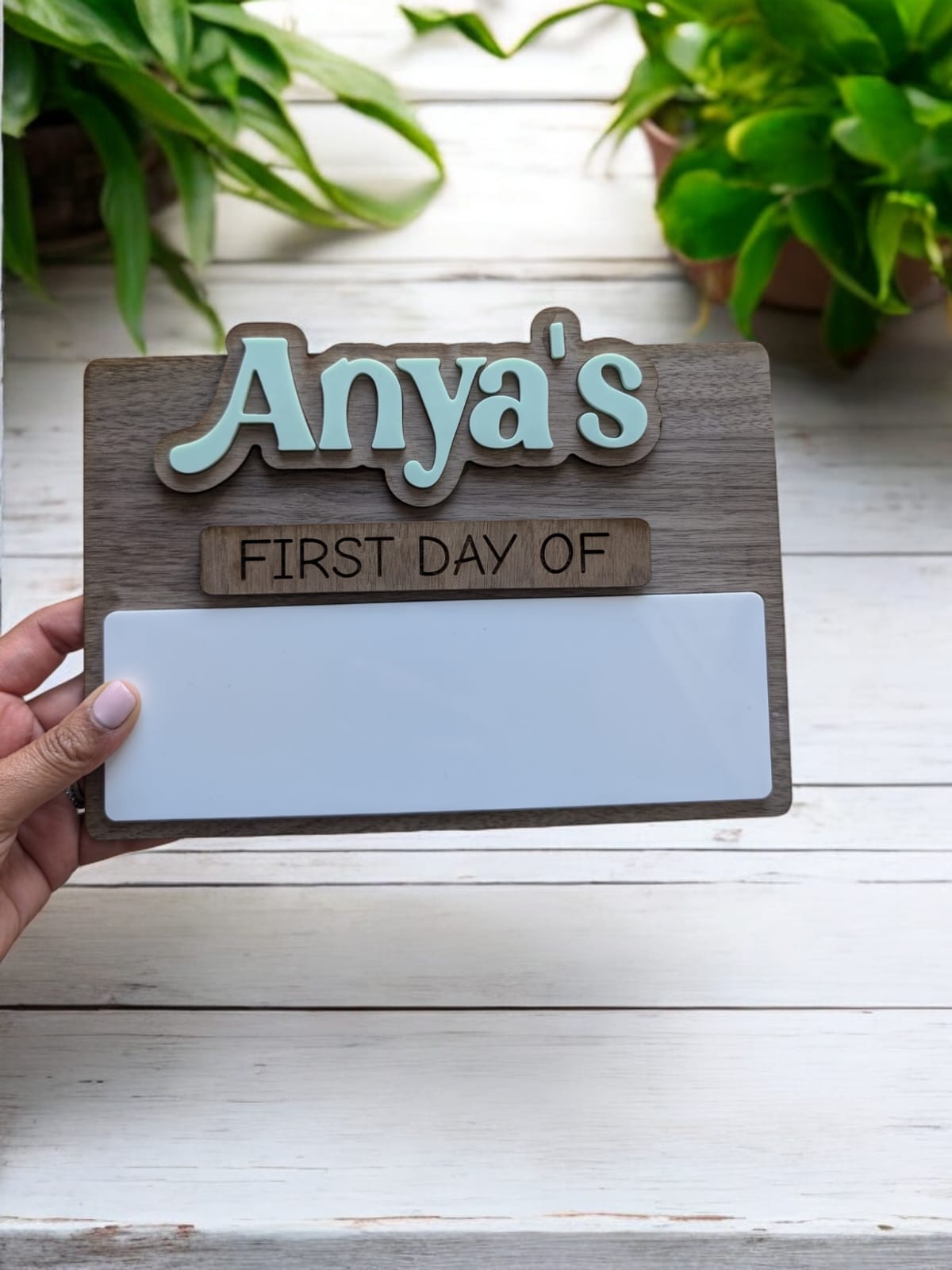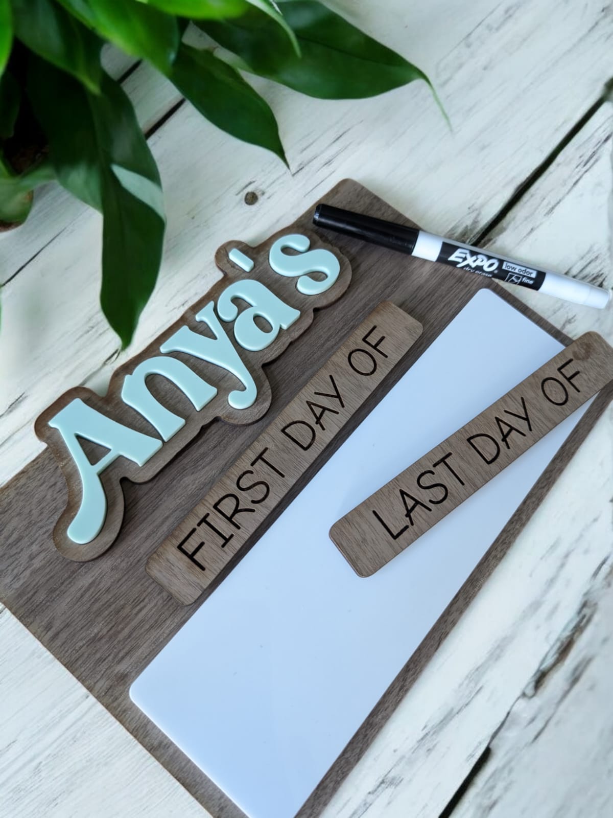 Commemorate your child's milestones with our personalized First Day/Last Day of School signs. Each sign is custom-made with your child's name, making it a special keepsake that captures their growth year after year. Designed with interchangeable plates, you can easily switch between the First Day and Last Day of School on the same board, offering convenience and versatility. Made with acrylic and wood materials, they are designed to last with care, creating cherished memories of your child's educational journey and beyond. Ideal for photo ops, these signs are a fun and lasting way to document each school year. This dry-erase board is easy to clean using a damp cloth or an eraser.