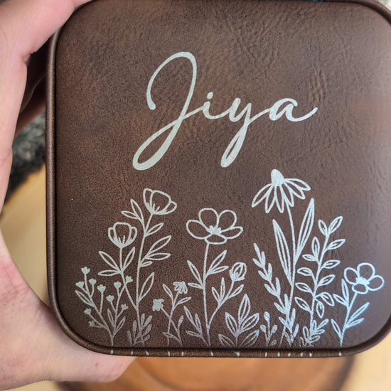 Keep your treasures safe in this personalized leatherette jewelry box, engraved with a beautiful blooming garden design.