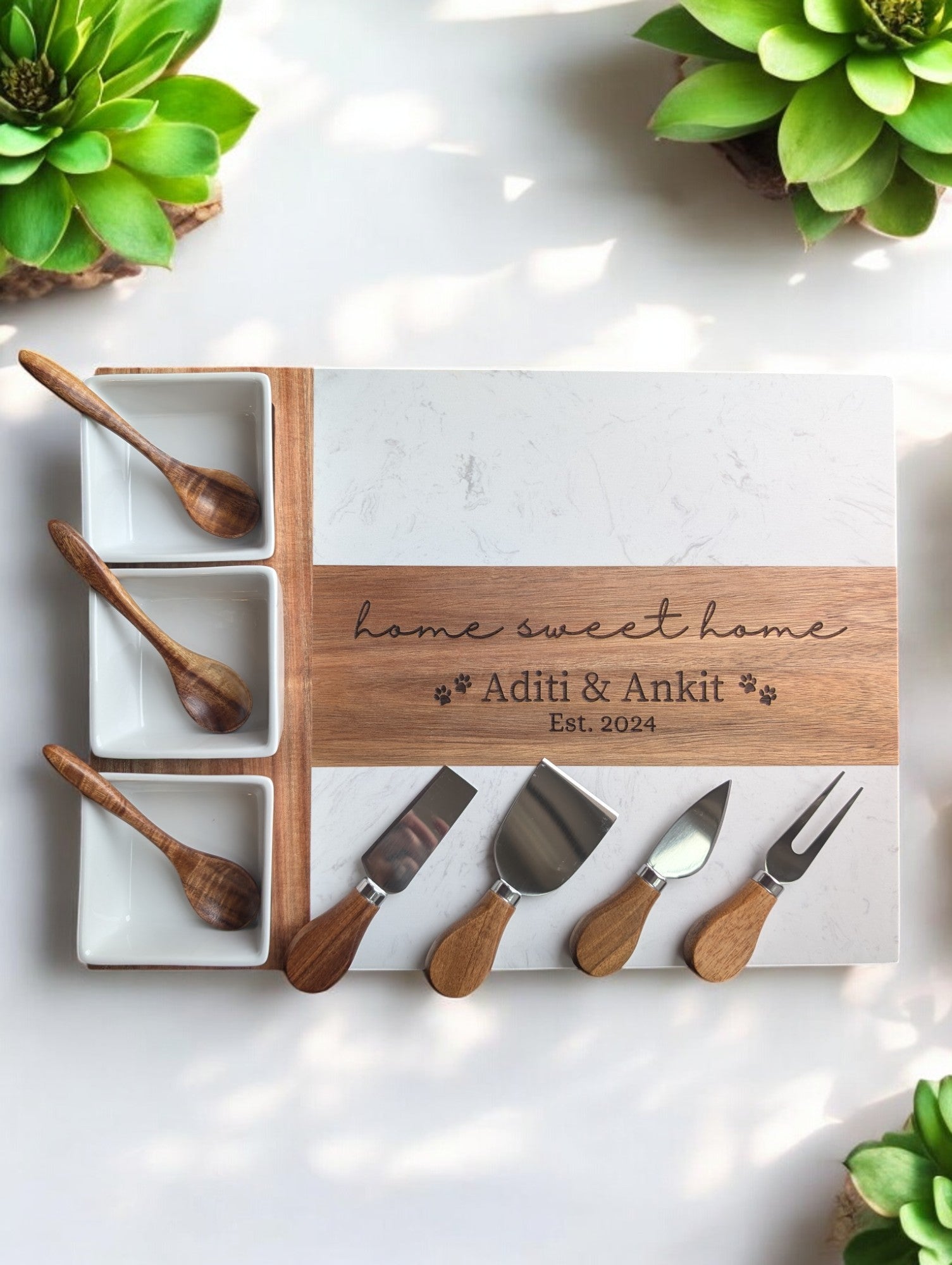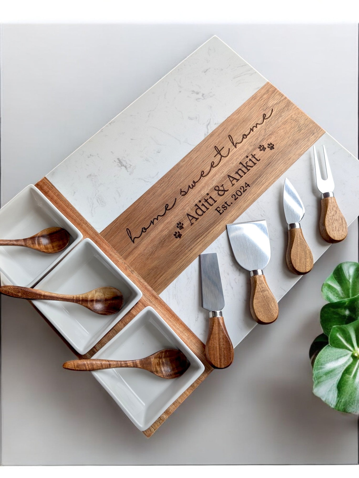 Experience the perfect blend of elegance and functionality with our Marble Charcuterie Board Set. Crafted from luxurious marble and premium acacia wood board comes as part of an 11-piece set. It includes three dipping spoons, three bowls, and four charcuterie utensils—everything you need to create a stunning spread. Each set is securely packaged in a foam box, with each item individually wrapped for added protection and easy storage.