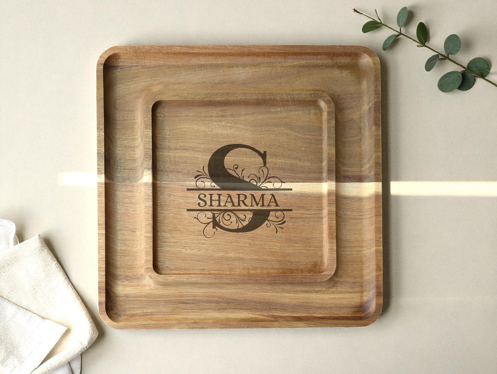 Introducing our personalized Acacia Serving Tray, beautifully engraved with your family name. Crafted from premium acacia wood, this square tray combines elegance and practicality — perfect for serving guests, displaying treats, or elevating your everyday table setting. Add a touch of warmth and family pride to every gathering with this timeless piece.