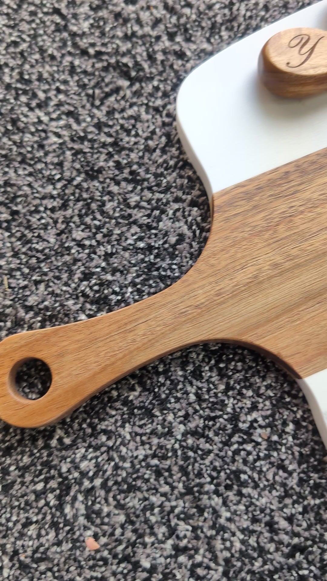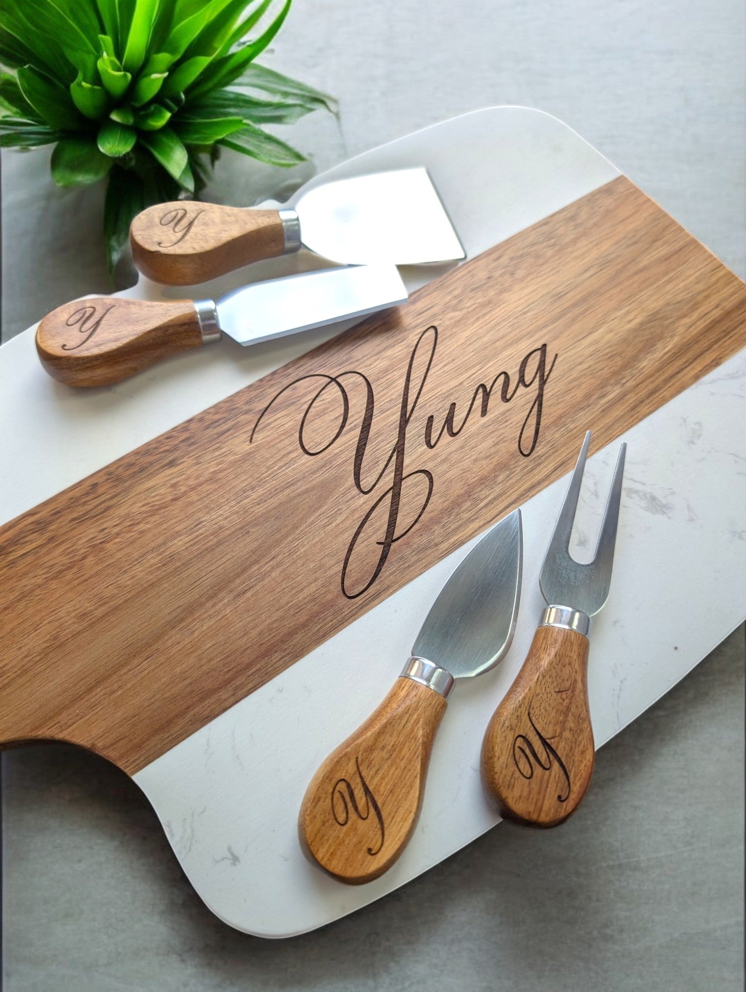 This sophisticated set of five wood and marble cheeseboards, complete with matching cheese knives, is perfect for entertaining or gifting. Each board features a custom-engraved name, blending classic elegance with a personal touch. Ideal for weddings, housewarmings, or special occasions, the set arrives in a sleek white marble box, thoughtfully designed with secure slots for each item.
