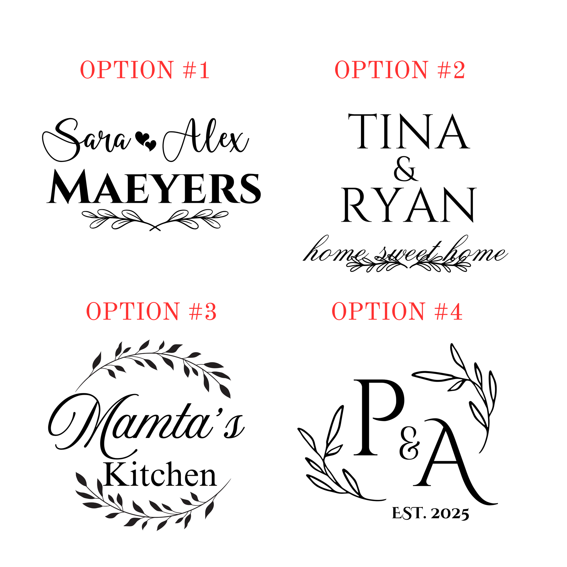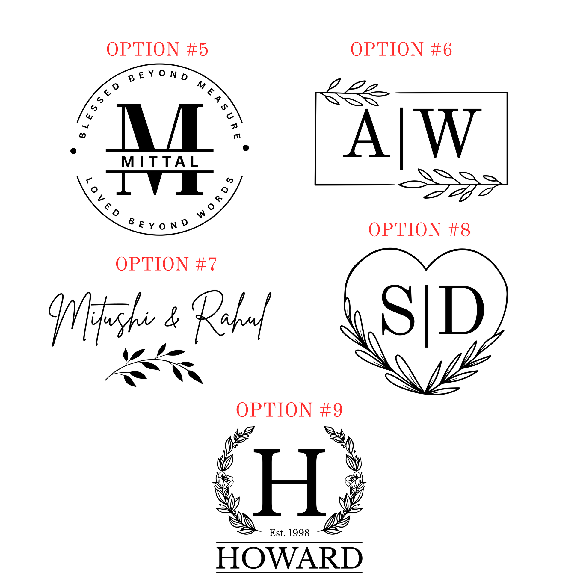 Please scroll through the design options and complete the required field accordingly. Add your names, date, or initials based on your selected design. Phrases will remain exactly as shown.