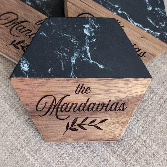 Hexagon Black Marble and Wood Personalized Coaster Set